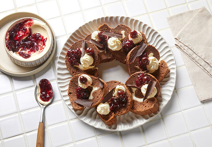 Beide Rollen auf einer Servierplatte zu einem Kranz anordnen. Mit geschmolzener Schokolade und Kirschmarmelade beträufeln und mit Schokoladenraspeln bestreuen.