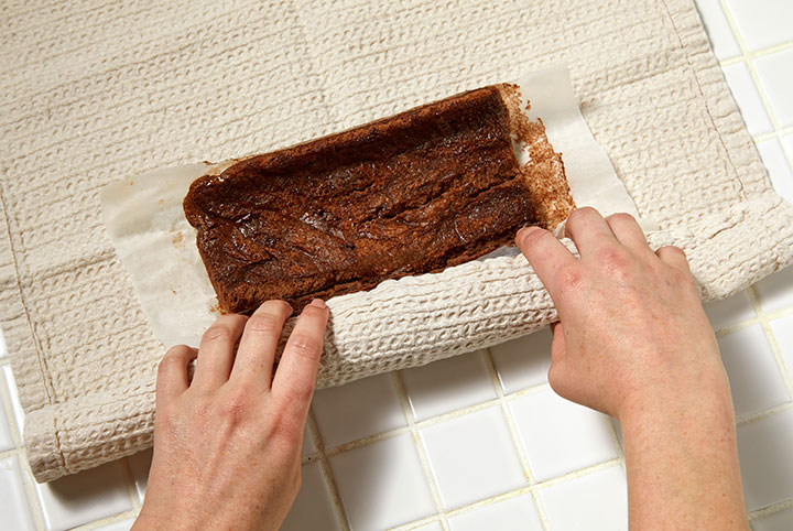 Eine Backform (20 × 26 cm) einfetten und mit Backpapier auslegen. Das Backpapier ebenfalls einfetten.
