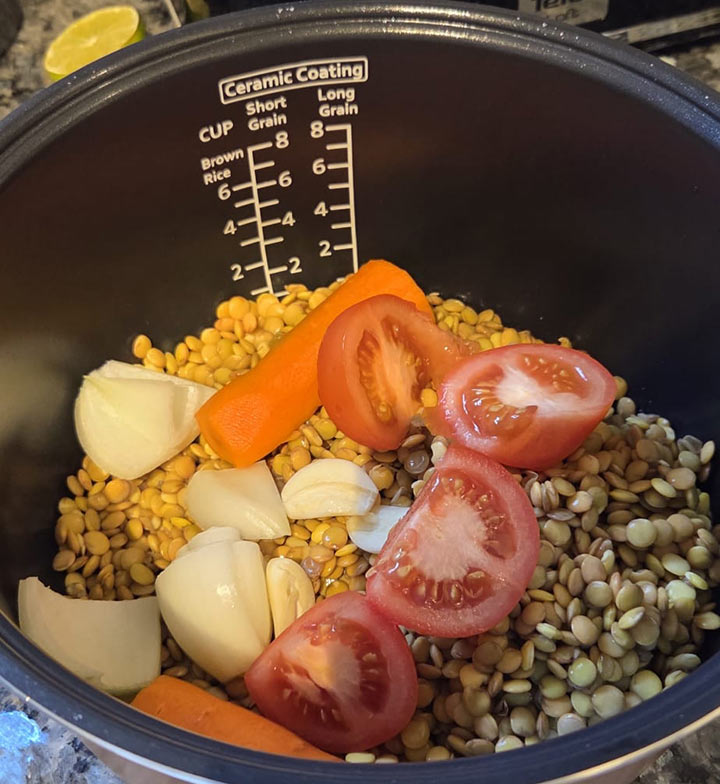 • Une fois la cuisson terminée, retirer les morceaux de légumes (carotte, oignon, ail, tomates) et les mixer avec une petite quantité de lentilles cuites. |