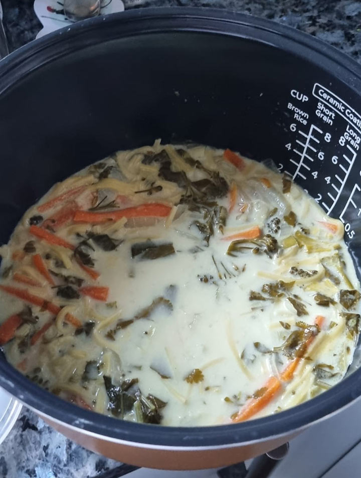 Ajouter ensuite le lait de coco et le bouillon de légumes. |