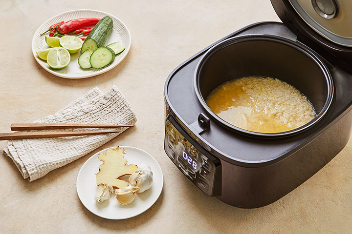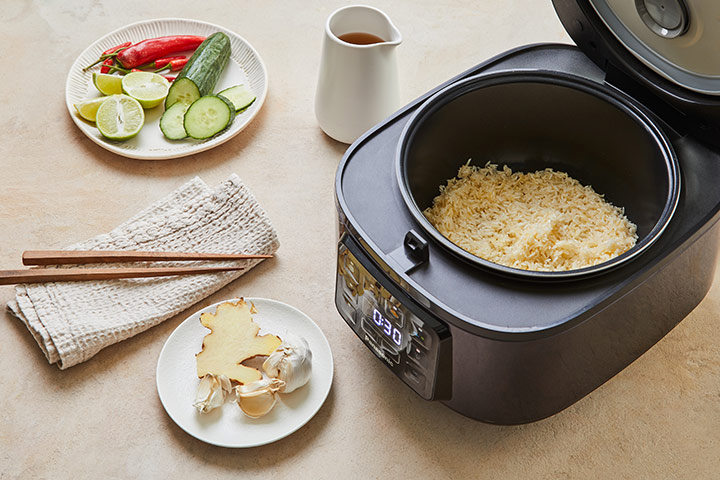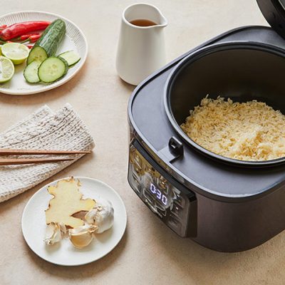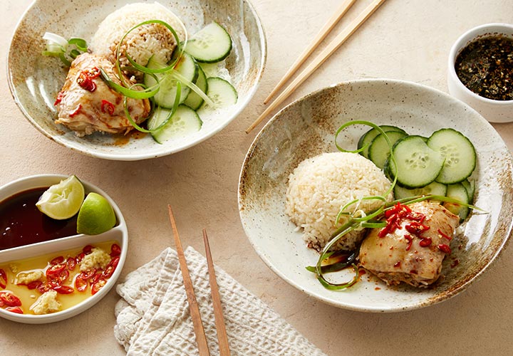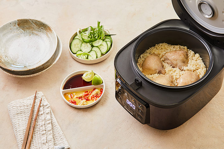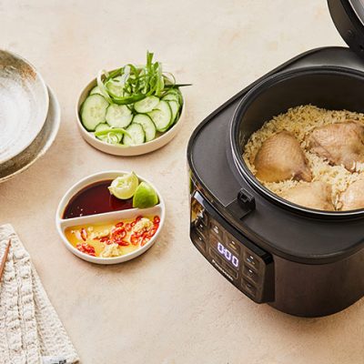 A közkedvelt szingapúri ételnek ezt az egyszerűsített, egytálételes változatát teljes egészében rizsfőzőben készítjük. Az omlós csirkecombokat közvetlenül az illatos fokhagymás-gyömbéres rizsen sütjük, megőrizve a hagyományos ízeket, mindenféle felhajtás nélkül.