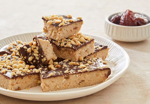 Puhára sütött, magas fehérjetartalmú nassolnivaló, amely tojásfehérje, cottage cheese, banán, zab és datolya turmixolt alapjából készül. Kíméletesen süssük a sütő funkcióval, majd olvasztott csokoládéval és pörkölt földimogyoróval vonjuk be, mielőtt szeletekre vágnánk.