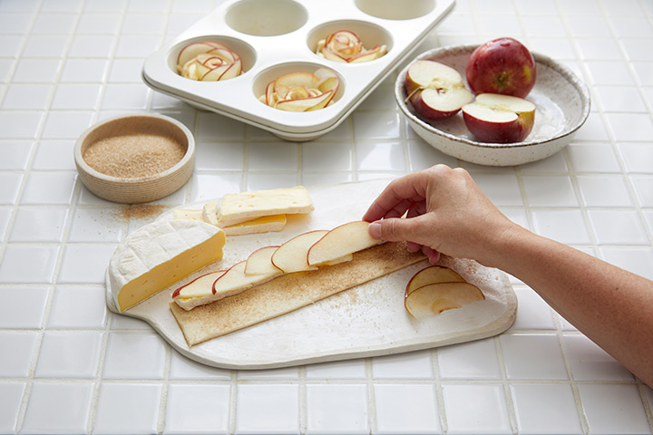 Tuck slices of camembert in between the apple slices along the strip. |