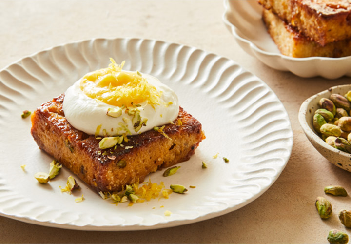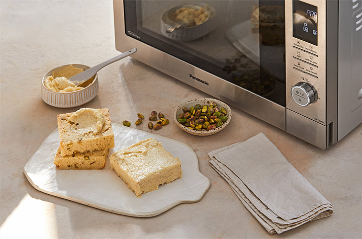 Thick slices of pistachio and white chocolate brioche are coated in a honey–butter glaze with lemon zest and baked in the Panasonic Combi Oven NN-CD88 until crisp and golden. Served simply with cream and lemon curd for a bright, indulgent finish.