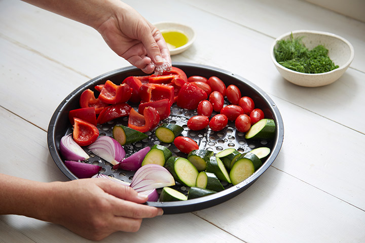 Place the baby marrows, red onion, red peppers and baby tomatoes into a bowl. |