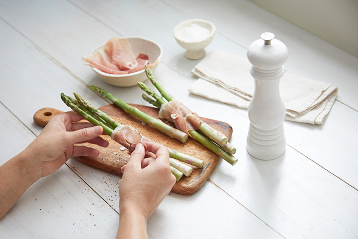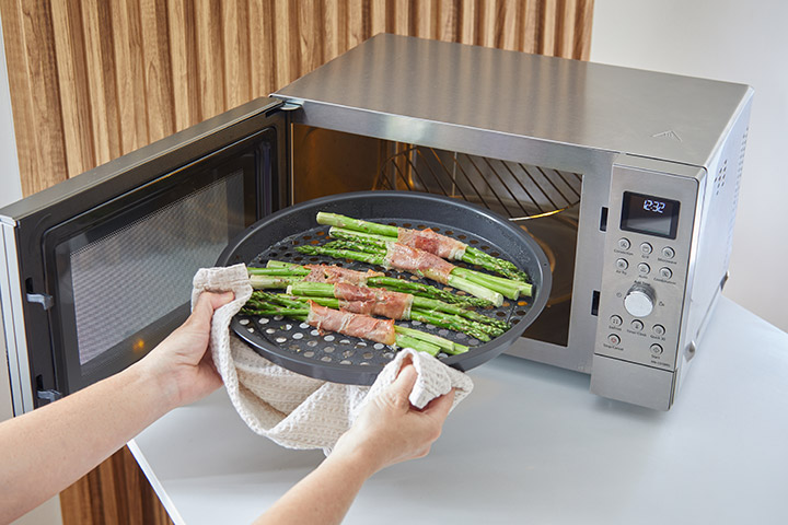 Tender asparagus spears wrapped in crisp prosciutto and cooked using the Panasonic Air Fry Combination Microwave Oven combination setting for a golden finish and perfectly tender centres. These neat little bundles make an elegant festive side or starter.