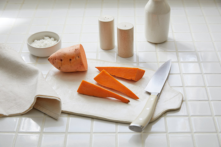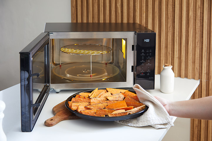 These crisp sweet potato chips are cooked using the Panasonic Air Fry Combination Microwave Oven’s combination setting for a golden, crunchy result. A light cornflour coating helps create an even, crisp texture with minimal oil.
